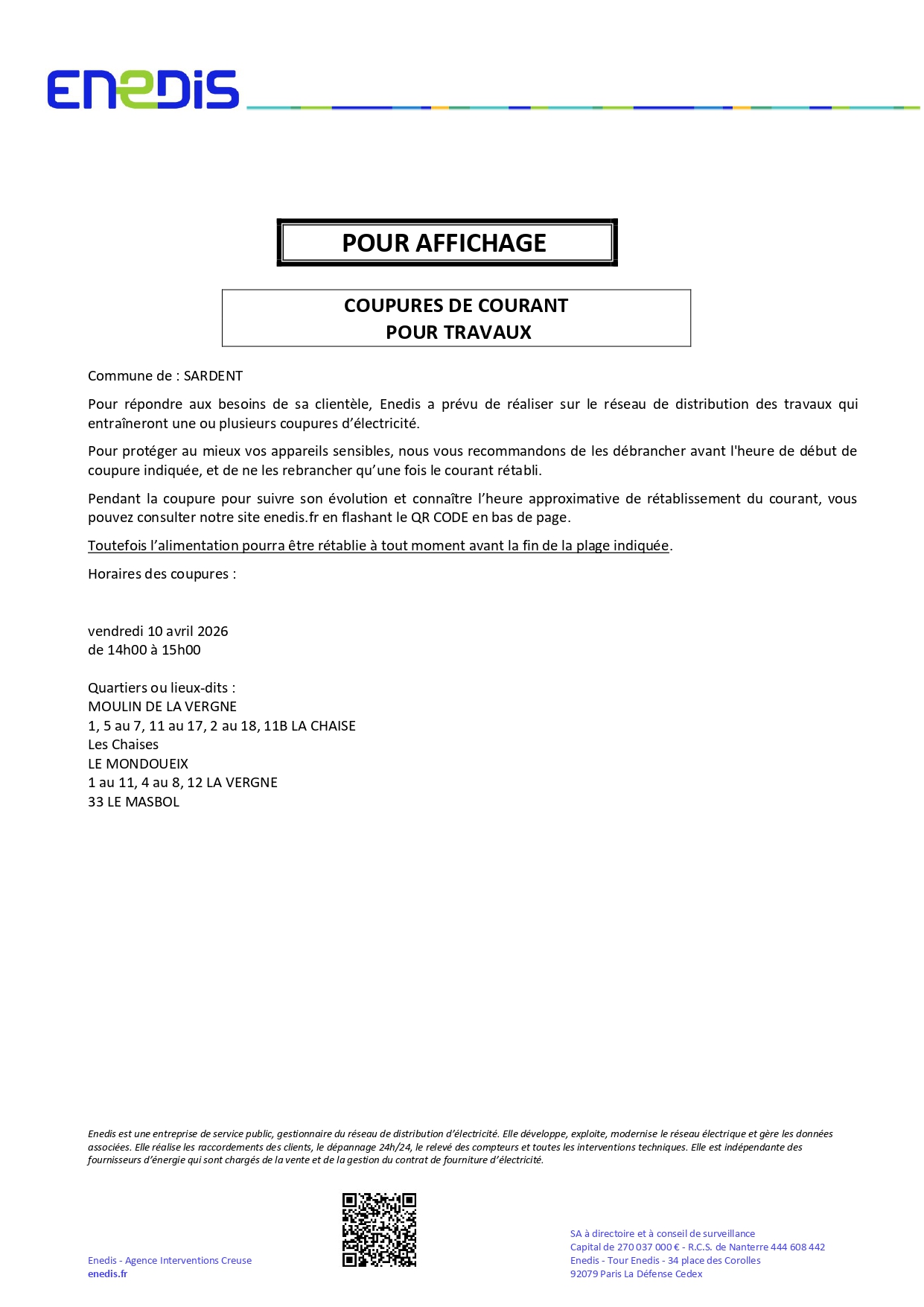 ENEDIS : Coupure de courant pour travaux